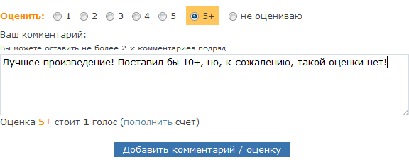 Оценка 5+26.05.13Прочли отличное произведение? Считаете что автор заслуживает максимальной оценки, но пятерки кажется мало? Теперь каждый имеет возможность поставить Пять С Плюсом за любое произведение!